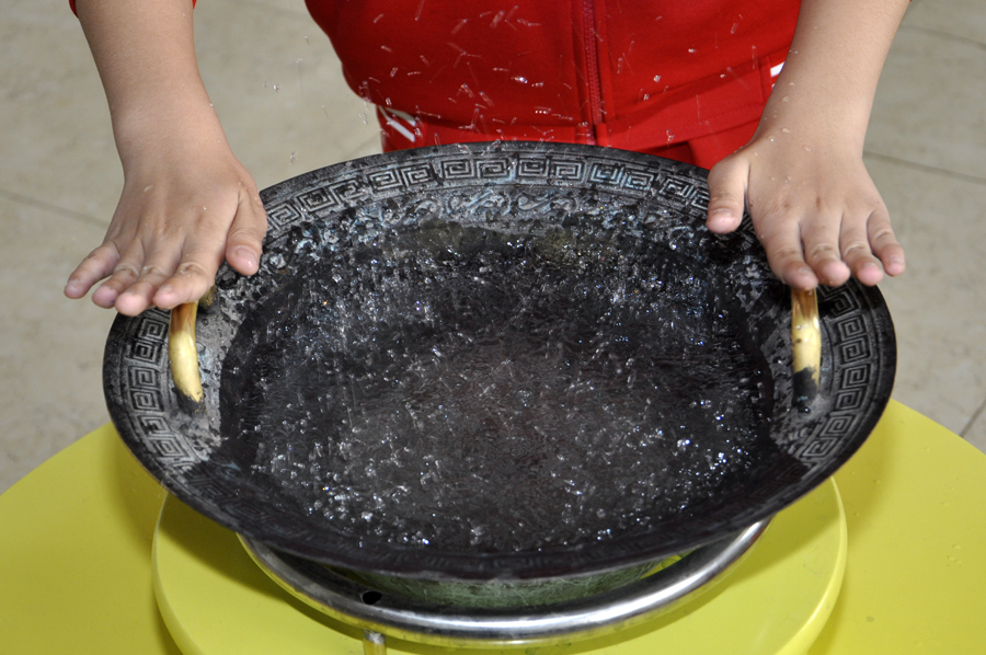 | 鱼洗:观察者用双手缓慢有节奏的摩擦鱼洗的双耳时,在水面会激起跳跃、奇妙的水花。 |