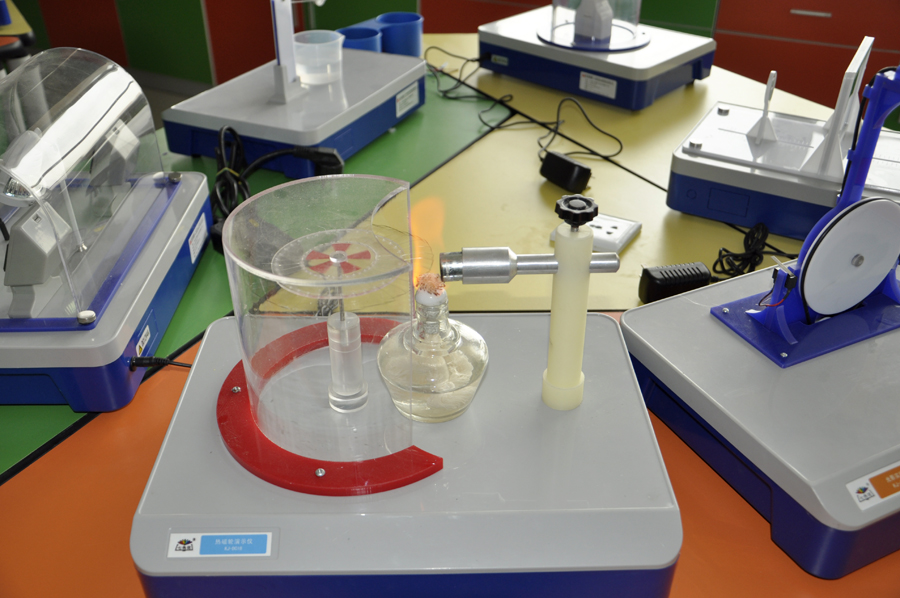 | 热磁轮演示仪:点燃酒精灯,转轮会旋转,什么原因呢? |