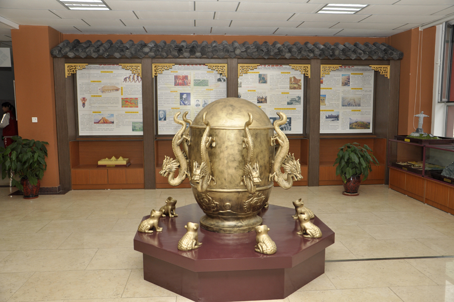 | 地动仪:东汉时期科学家张衡发明了地动仪,这个地动仪像一个酒樽,内部有一根细长竖直的杆直立在正中间,地震时,这根直杆会倒向地震的方位,击中那个方位的龙首机关,龙口就会张开,吐出一颗铜丸,正落在下面的铜青蛙口中,于是就会判断出哪个方位发生了地震。而今天,在我们的展厅当中,活跃着一批又一批的欣喜而好奇的学生,通过用脚跺地的方式证实地动仪的功效。 |