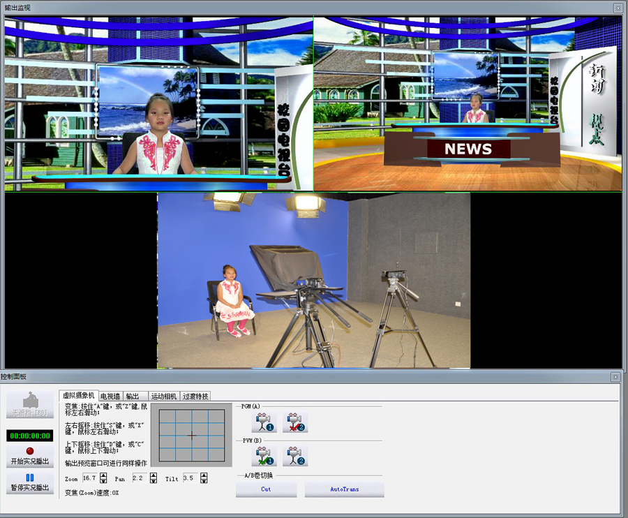 演播室: ??? 为了丰富校园文化生活,同时为我校师生搭建新的 展示平台,此演播室应运而生。整套系统包括:视频摄像系统、三维虚拟演播系统、多功能演播系统、图文字幕、提词器等设备。 |